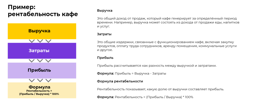 Пример:Представьте, что кафе заработало 150 000 рублей чистой прибыли при выручке 750 000 рублей. Рентабельность составит:(150 000 / 750 000) × 100% = 20%