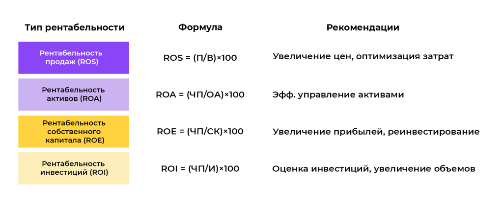 | Вид | Рентабельность продаж (ROS) | Рентабельность активов (ROA) | Рентабельность капитала (ROE) |
